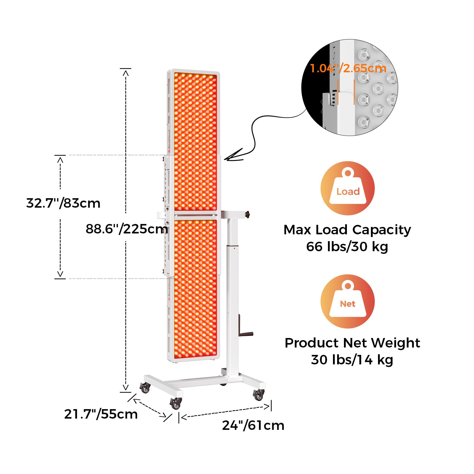 With 4 smooth 360° swivel casters and built-in brakes, the red light stand rolls easily into position or slides under your bed (requires at least 4 inches of clearance). Simply lock the brakes to keep everything stable and secure while you enjoy your red light therapy.